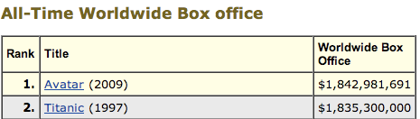 This number is only going to go up as Titanic got to this number through a re-release after it won Best Picture. I remember seeing it when it first came out in December 1997 or maybe January 1998 and then seeing it again for my birthday in June. I don’t really see a re-release of Avatar in its future. Although, it could be a possibility since there still isn’t a home release technology that can preserve the film’s 3D self.