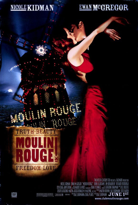 I absolutely LOVE Moulin Rouge! It is one of my Top Ten Favorite Films of All-Time. I can watch it a million times and never be sick of it. Sadly, I didn’t get to see it in theaters when it was first released and had to wait until it was out to rent. When I first rented it, the rental store only had it on full-screen VHS and even in that crappy condition I fell in love with it. Luckily, we went out of town shortly after that and I bought it on DVD and when I finally saw it in all its widescreen glory I saw SO MUCH that got cut by the butchering that is “full screen.” I also bought both soundtracks on CD and most definitely have them in my car as I type. I think this film was one of the first films I ever owned on DVD, actually. It’s also one of the first films that I ever “fangirled” over, if you know what I mean.  A few years ago I finally got to see it on the big screen, thank you so much Shattuck Cinemas in Berkeley for your $5 Flashback Features! It was, I can’t even describe how amazing it was on the big screen. Those of you who have seen it in theaters know what I mean. It is such a visually lush film, that it’s almost a pity to watch it anywhere but a theater! The film was made on a $52 mil budget and made over $179 mil worldwide. It was nominated and won countless awards. It was nominated for Best Ensemble Cast at the SAGs, named the best film of the year by the National Board of Review, as well as many other critics awards. It was nominated for six Golden Globes, winning three: Best Original Song, Best Original Score (won), Best Actor in a Musical/Comedy – Ewan McGregor, Best Actress in a Musical/Comedy – Nicole Kidman (won), Best Director, Best Picture Musical/Comedy (w0n). It was nominated for twelve BAFTAs, winning three and ten Australian Film Institute awards, winning five. At the Oscars that year it was nominated for eight awards including Best Picture, but only won two: Best  Costume Design and Best Art Direction. Luhrmann, however, was not nominated as Best Director. I remember at the time after a clip of the film was shown, Whoppi Goldberg, who was hosting, quipped “I guess Moulin Rouge! just directed itself!” Considering Luhrmann likes to rehearse for weeks before shooting a single scene and how insanely complicated the film is, snubbing him as a director was a major burn on the Academy’s behalf. The American Film Institute listed the film on two of its “100 Years…” lists: 100 Years… 100 Songs: “Come What May” #85 and 100 Years of Musicals #25.