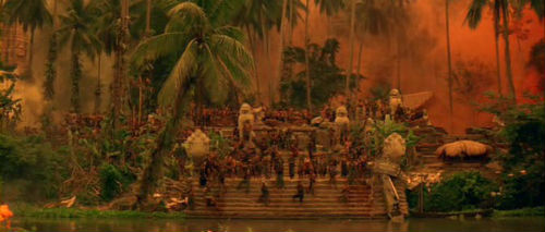 I’m pretty sure it was three hours before we even got this minimal glimpse at Marlon Brando, who was given top-billing (one could argue the credits are in alphabetical order, but still). Legend has it the shadows and many close-ups of Brando’s face were to hide the fact that Brando had gained a lot of weight. Regardless of the why behind this technique, it works brilliantly and the result is Kurtz as an almost mythical figure – much like the god his followers are described as believing he is. The film ends with the same lines as the book on which it is (loosely) based: “The horror. . .the horror.” But before we get to those lines, Kurtz explains his philospohy to Willard, in one of the most perfectly delivered film monologues I’ve ever seen: