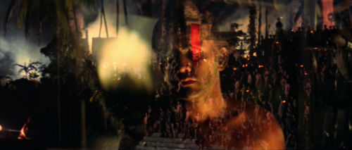 Coppola superimposes Willard’s head over other scenes throughout the film, but I think it is most effective in the denouement of the film. It’s as if all the madness – the jungle, Kurtz’s followers, Willard – have become one with the death of Kurtz. With his final actions – carrying out his orders – Willard has given up all his agency and is now irrevocably part of it all.