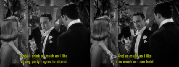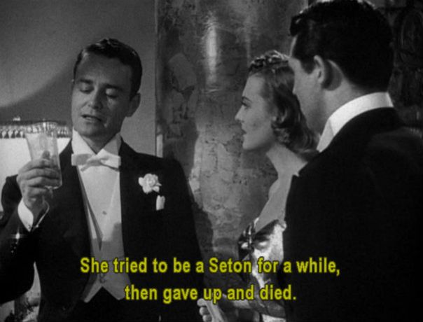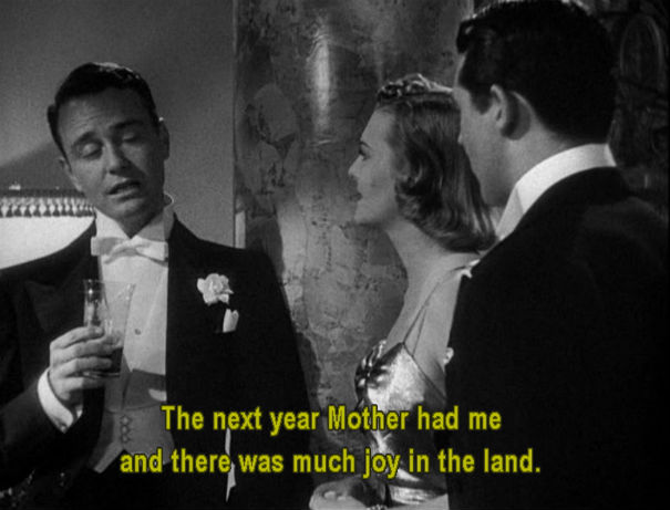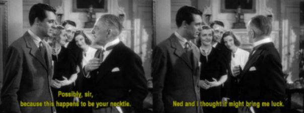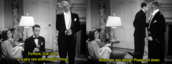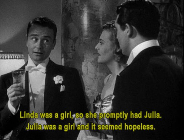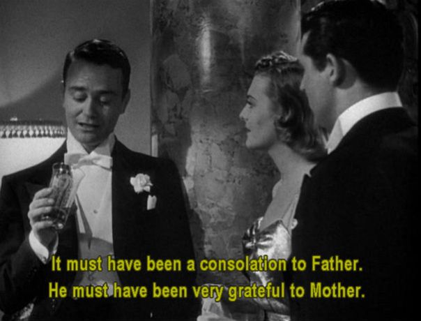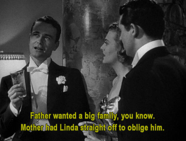 This is another scene I really love. Their father is on his high horse about “true love,” and Ned’s immediate reaction is to get up and leave. Has he been in love and been hurt? Does he think his father never really loved his mother? We already know that he knows that Linda is in love with Johnny (Cary Grant) and that the love between Johnny and Julia is more than likely not “true love.” But could it mean something more for Ned? Could there be more to his alcoholism than is given to us in the film? I wonder if Lew had thought of these thing, too?
