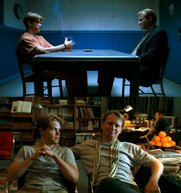 I keep waiting for Stellan Skarsgård to be bigger in America because he is just so good. His character is the closest thing the film has to an antagonist (unless you count the Harvard grad student in the bar scene who likes apples), but he is a character with flaws just as deep as the others and with his nerves just as exposed. There are times when you really hate him, but you can’t altogether dislike a character who tries to hit on pretty girls by comparing a mathematical theorem to an erotic symphony. There’s a scene towards the end of the film where Will sets a theorem on fire and Prof. Lambeau tries to save it that just breaks my heart.