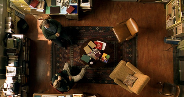 This overhead shot is used a few times in this scene when Sean tells Will about how he met his wife. It’s such an arresting view of the scene.