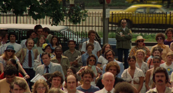 Just before Bickle’s botched attempted assassination, he stands at the edge of the crow and watches the senator’s speech. He sticks out like a sore thumb.