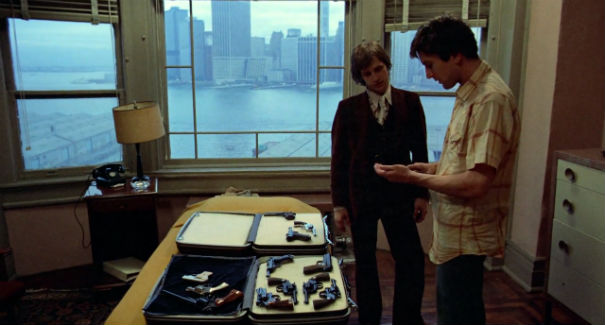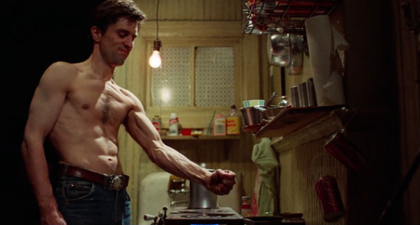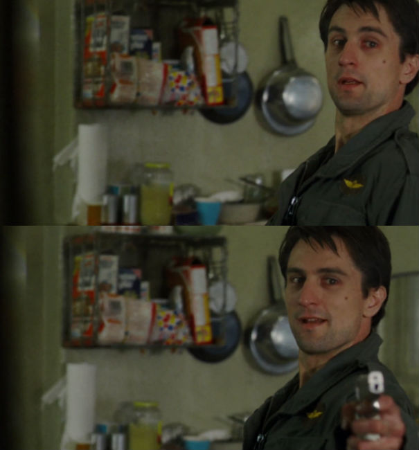 A million words have been written about this “You talking to me?” scene (including Scorsese gushing about how he wishes he could have filmed it in 3D, to which I say, “Shhhh. Scorsese, no.”), which was completely ad-libbed by De Niro, so all I really want to say is look at that framing. Look. At. It. This off-centered framing mirrors Bickle’s own self, which is more than slightly off as well.
