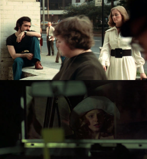 I want to talk about a few of Scorsese’s directorial touches, some of which I can’t really discuss with images because they need motion. Scorsese’s direction in this film is not subtle and his use of movement with the camera never allows you to forget you are watching a film. In one instance, when Bickle calls Betsy to apologize, the camera starts out on Bickle at a payphone, then pans to an empty hallway. Scorsese holds the shot of the hallway through most of the conversation, then Bickle re-enters the frame and exits down the hallway. I just love it so much.