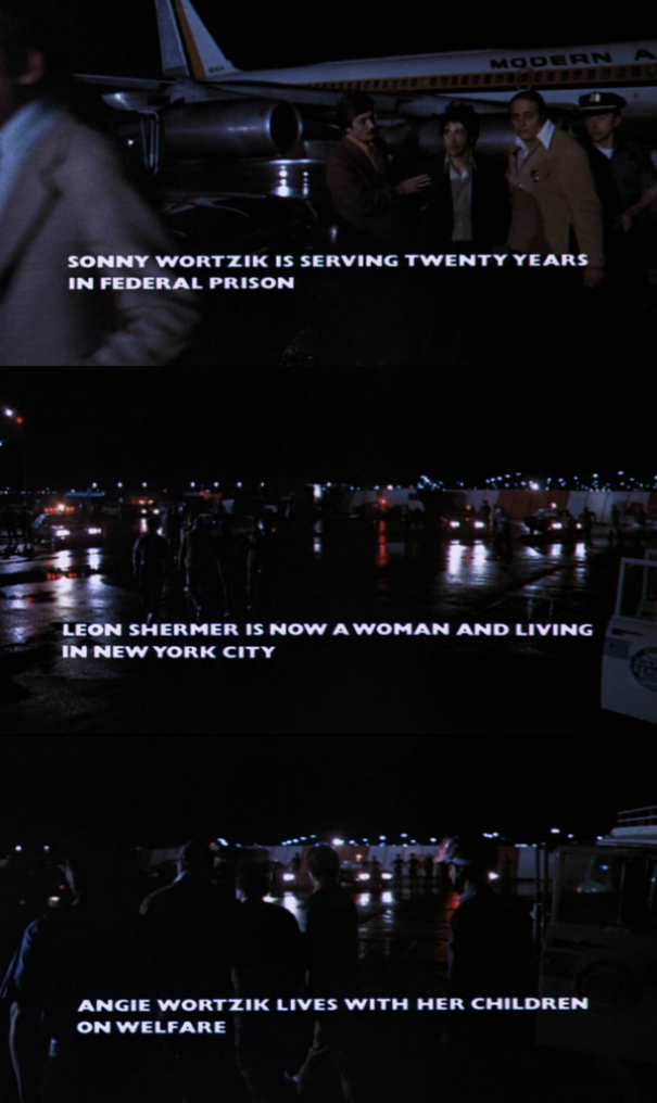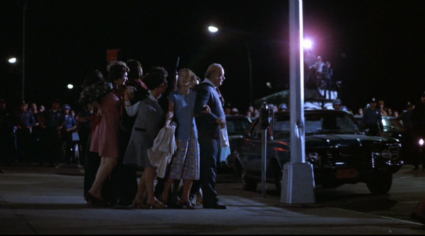 Eventually, Sonny and Sal believe they will be taken to the airport and given a jet that will take them to Algeria (a funny choice, if you think about all the shit that went down in Algeria in the 60s. . .). They move to the car using the hostages as a human shield. Sonny’s declaration of “Fuck, we did it!” when they safely make it to the car is genuine and so naive. Does he really believe this is going to end well? Earlier, when his mother tried to tell him she’d worked it all out with the FBI and that they understood why he did it and everything was going to be okay, he blew her off. He knew that wasn’t the true. Why does he believe it now? Before they left, Agent Sheldon assures Sonny that they will “take care” of Sal. So, perhaps, he knew along how the events were going to play out.