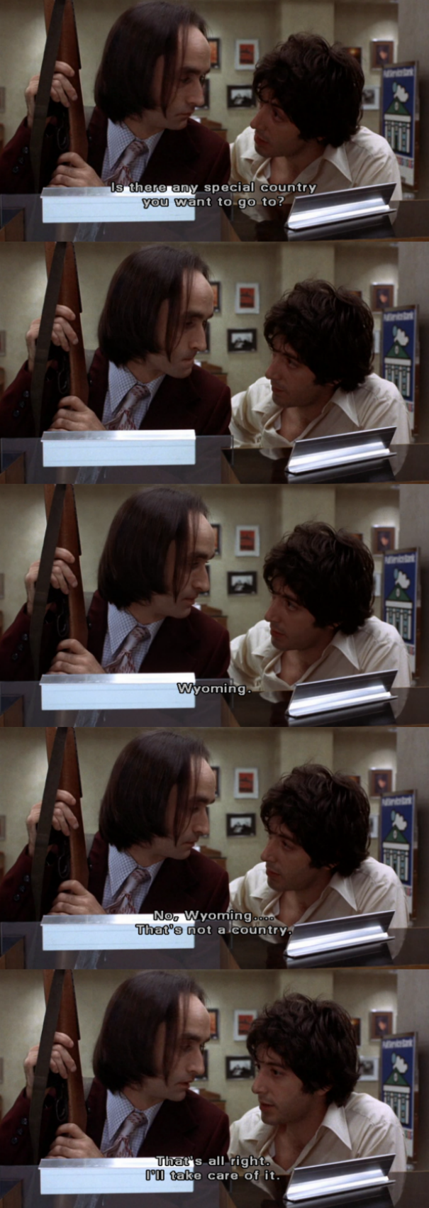 I’m wondering if this is verbatim from the incident, from the script, or one of Pacino’s improvisations. Either way, it captures the ethos and anger of an entire generation.