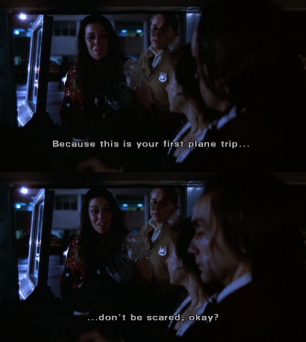 Before they get on the plane, they release one of the hostages. She in turn tells Sal not to worry about his first trip on an airplane and hands him her rosary, which he snatches and clutches to his chest. It’s a tender moment, a humanizing moment. For a second, you think maybe they have made it. The next thing you know, however, Sal’s got a bullet in his head.