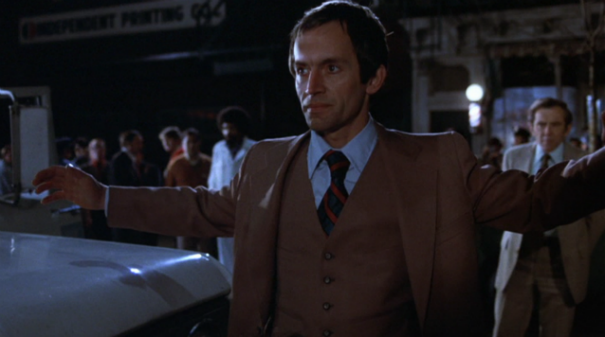 Earlier in the film Sonny asks for his wife and Lumet intercuts the action with shots of his wife Angie at home with their kids. About halfway through the film we’re told his wife has finally come. The car door opens and Leon (Chris Sarandon) exits. We discover that this is the wife that Sonny actually asked for and that the two were married a year ago by a priest (who was later disrobed) in a ceremony that was attended by Sonny’s mother. Sonny was robbing the bank to pay for a sex-change opperation for Leon, who had come to realize he was a woman trapped in a man’s body. This is, as Lumet himself put it, “exotic stuff” for 1975. Sarandon plays Leon like a battered wife, frail and emotionally disturbed. For his work he was nominated for Best Supporting Actor, losing to George Burns in The Sunshine Boys.