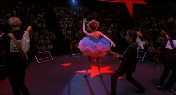 While the song may not be the best ever, she’s got “it” and everyone can tell. The art direction in this club (and the whole movie, actually) is basically everything I love. Neon and bright colors and image overload. Fabulous. Jackie meets the lead singer of the rock band that played right before her, goes off with him and has a one night stand. She’s frank about what she wants from him (not much) and it’s refreshing to see a young woman’s sexuality displayed in such an empowering and positive way. Too bad thirty years later, we don’t get this that often.