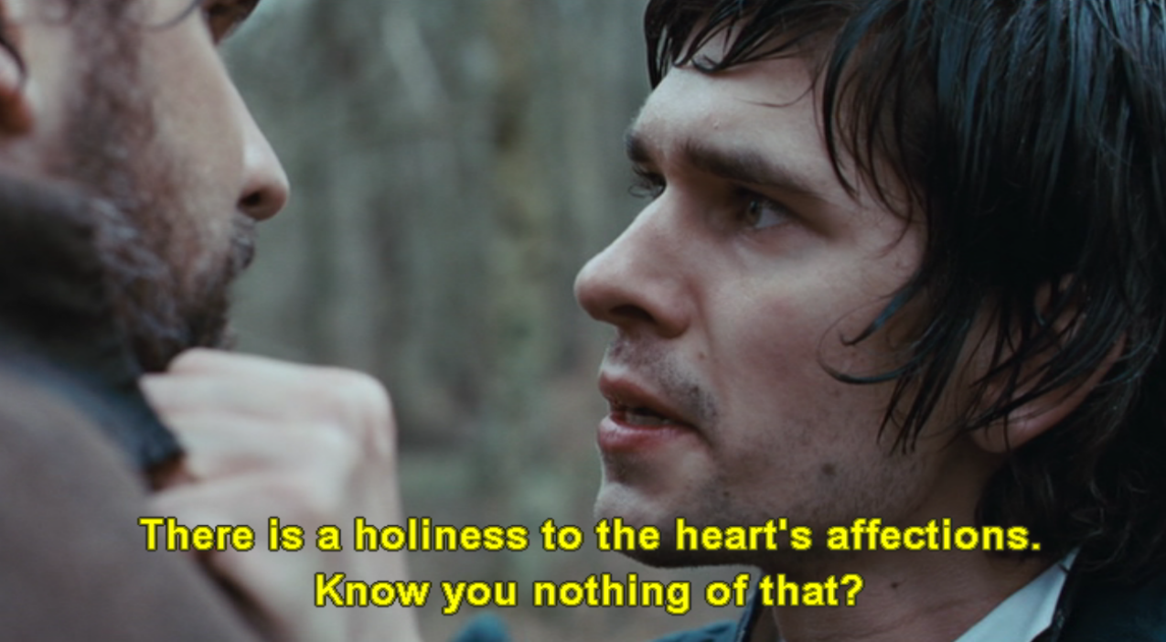 I should write a bit more about Brown because Paul Schneider does an amazing job making you really hate this character for most of the movie and then towards the end you feel how much he truly loved Keats (even though you still sort of hate him). This scene comes after he’s majorly teased Fanny then sends her a joke Valentine while Keats was away. This causes strife for the would-be lovers. Keats and Fanny are both so hurt by Brown, but then Keats’s reaction isn’t the best and Fanny leaves them both in a field, frustrated and angry.