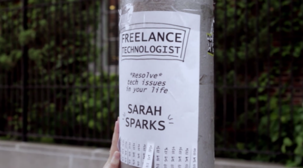 Sarah Sparks (Anna Margaret Hollyman) lives in New York City with her boyfriend and is fascinated by technology. She helps people fix their phones, computers, etc. because she’s always been a bit of a tinkerer. She also films strangers as she asks them about their relationship with technology.