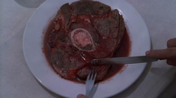 There’s a lot of gross shots of meat in this movie. If you don’t already know, the film is about cannibalism and Bird continues to play with this theme by juxtaposing in these shots of the regular animal meat people eat all the time, but looking really fucked up.
