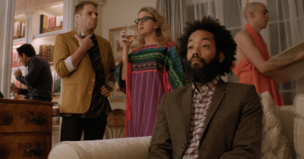 At a Q&A after the screening I saw at SXSW, Terruso said the party-goers at the salon David finds himself trapped in were mostly based on real things she had seen at various gatherings of New York art types. One review I read of the film coming out of the festival said the film plays like a one crazy night film a la After Hours, only the increasing stakes is how pretentious the people around David can get. I thought that was a pretty accurate take on this part of the film. David is trapped among people he mostly cannot stand, having been accidentally separated from Jennifer on their way to the party. Watching him keep his cool among all these ridiculous people is quite entertaining.