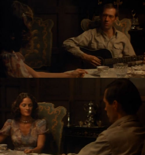 Woody Guthrie: Pauline, let me tell you somethin’. When I. . .well, when I was on the road, I met a lot of different kinds of people. There was bums and freeloaders. There was families that was torn apart. And poor people that just was achin’ for some kind of work. And men that are just tryin’ to get somewhere. Anywhere. They all got somethin’ in common, that every one of them had somethin’ to give me. Then you meet some man that’s got some money, and he’ll be… tied up and anxious. The human thing is just gone. It’s just gone, cos he’s afraid. Afraid that he’s gonna lose somethin’. He’s afraid to smile, cos somebody’s gonna swipe his teeth out his mouth.