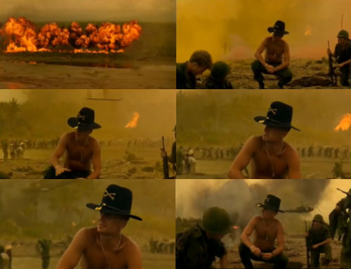 Kilgore: I love the smell of napalm in the morning. You know, one time we had a hill bombed, for 12 hours. When it was all over, I walked up. We didn’t find one of ’em, not one stinkin’ dink body. [beat] The smell, you know that gasoline smell, the whole hill. Smelled like. . .victory. [beat] Someday this war’s gonna end.