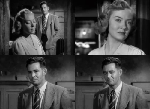 As we continue with Noirvember, I bring one of my favorites from the era, Edward Dmytryk’s Crossfire. I read one critic who said it is more of a “message film” than a film noir and I think that is kind of a ridiculous statement, as it assumes the two are mutually exclusive. If you’ve seen The Celluloid Closet, then you know that originally the crime in this film was perpetrated out of homophobia, rather than anti-Semitism. Under the Hays Code, clearcut mention of homosexuality was prohibited because it was consider “sexual perversion.” I’m going to write a little more about the origins of the film after the cut. Crossfire was nominated for five Academy Awards, though it didn’t win any: Best Adapted Screenplay, Best Supporting Actor Robert Ryan, Best Supporting Actress Gloria Grahame, Best Director and Best Picture. The other films nominated for Best picture that year were The Bishop’s Wife, Great Expectations, Miracle on 34th Street and winner Gentleman’s Agreement (which is also about anti-Semitism). Crossfire was one of the twenty highest-grossing films of 1947, along with three other noirs: Body and Soul, Possessed and Dark Passage.