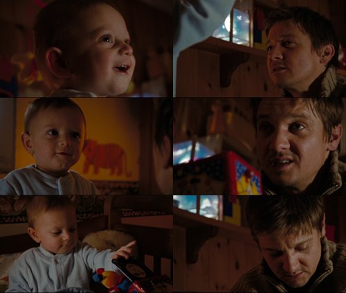 Staff Sgt. William James: You love playing with that. You love playing with all your stuffed animals. You love your mommy, your daddy, your nature pajamas. You love everything, don’t you? [beat] Yeah. But you know what, buddy? As you get older, some of the things that you love might not seem so special anymore, you know. Like your jack-in-the-box. Maybe you realize it’s just a piece of tin and a stuffed animal. But the older you get, the fewer things you really love. And by the time you get to my age, maybe it’s only one or two things. [beat] With me I think it’s one.