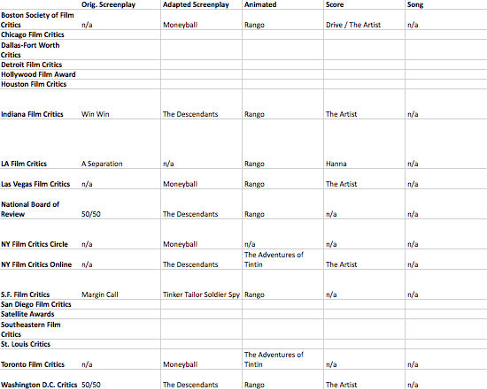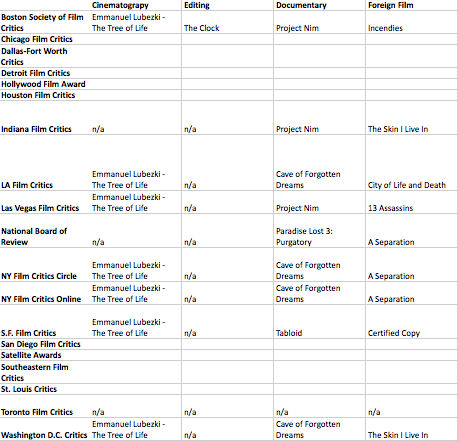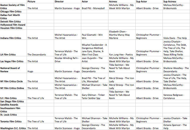 If my chart shows anything, it’s that The Artist is leading right now for Best Picture and it looks like Lubezki might just finally win himself an Oscar for his work on The Tree of Life. Also, Jessica Chastain is going to have a problem come Oscar time because per Academy rules a performer can only be nominated for one performance per category, so she may end up splitting her votes between too many roles and end up nomination-less.